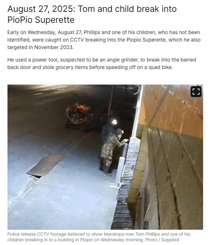 这些年来,Phillips一直躲藏在一个叫马罗科帕(Marokopa)的地方,这里是个特别小的村庄,一共就三条道,警方猜到Phillips大概会走哪条道,提前埋伏了尖刺,Phillips果然中计,跑路时车胎被扎,只能带着孩子被迫走路逃亡......